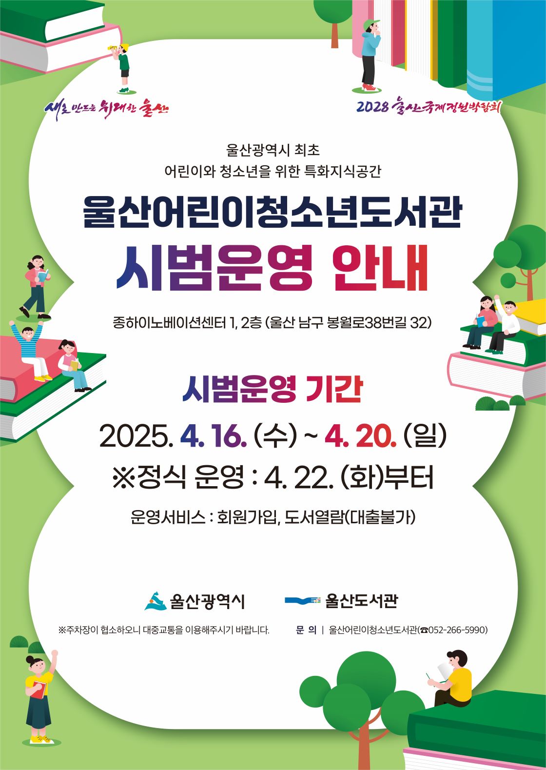 ★ 울산어린이청소년도서관 시범운영 안내 ★ 울산어린이청소년도서관 개관에 따라 아래 기간 동안 시범운영하오니 이용에 참고하시기 바랍니다. ○ 시범운영 기간 : 2025. 4. 16.(수) ~ 4. 20.(일) ※ 정식운영 : 4. 22.(화)부터○ 운영서비스 : 회원가입, 도서 관내 열람 (도서 대출 불가)