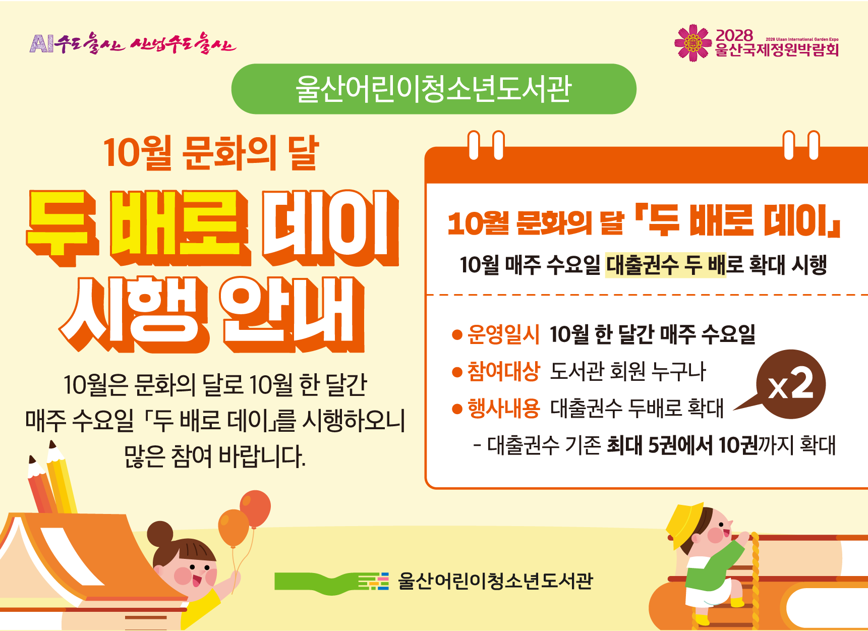 ★10월 문화의 달「두 배로 데이」시행 안내★울산어린이청소년도서관에서는 10월 문화의 달을 맞아아래와 같이「두 배로 데이」를 시행하오니 많은 참여 바랍니다.○ 행사기간 : 10월 한달 간 매주 수요일○ 참여대상 : 도서관 회원 누구나○ 행사내용 : 대출권수 2배로 확대(기존 최대 5권 ▶ 최대 10권)