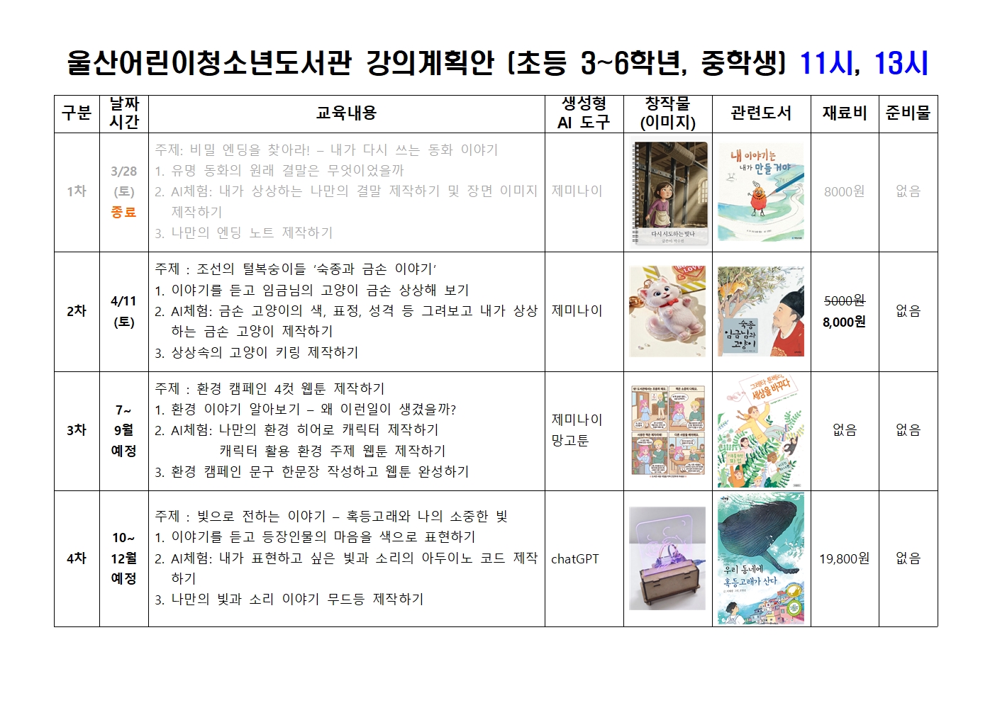 책 밖으로 나온 AI <무한상상 배움터> 책 속 인물, 동물, 배경을 생성형 AI로 이미지, 영상화 하여 독서 경험과 시각적 사고력 확장 (※분기별 1회 운영)
