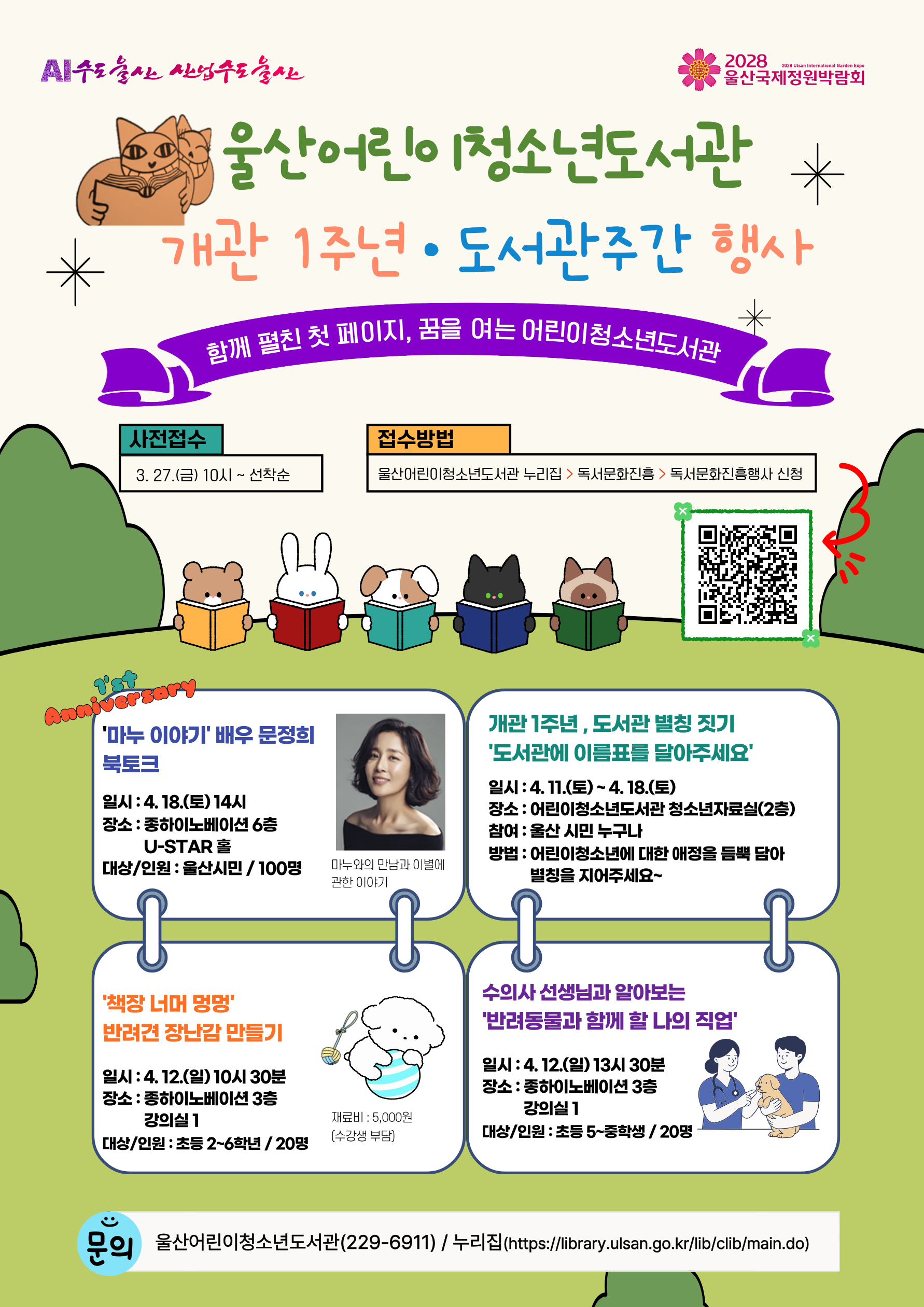 [체험 3] 숙종이 사랑한 고양이 금손 이야기 (일 시) 2026. 4. 11.(토) 11:00, 13:00 (장 소) 종하이노베이션 6층 U-STAR 홀 (대상/인원) 초등 3학년 ~ 중학생 / 50명 (각 25명씩) (내 용) 반려동물 키링 만들기, AI활용 쇼츠 영상 만들기 ※ 별도 접수 : 4. 1.(수) 09:00 / 온라인 접수 [부대행사] 개관1주년, 도서관 별칭 짓기 '도서관에 이름표를 달아주세요' (일 시) 2026. 4. 11.(토) ~ 4. 18.(토) (장 소) 울산어린이청소년도서관 청소년자료실 (2층) (내 용) 개관 1주년을 기념하여 시민들이 도서관의 별칭을 지어주세요, 채택된 별칭은 홍보에도 활용됩니다 (혜 택) 채택된 별칭 제안자에게는 대출권수 2배 혜택 부여 (1년간)